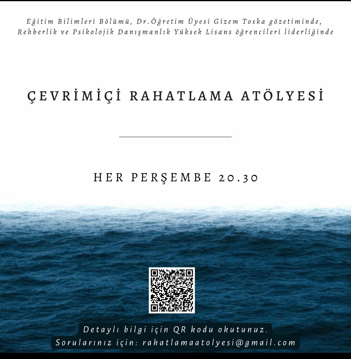 BÜREM'le iletişim içinde, Rehberlik ve Psikolojik Danışmanlık Yüksek Lisans programı öğrencileri Dr. Gizem Toska gözetmenliğinde her Perşembe saat 20.30'da BULive'da çevrimiçi rahatlama atölyeleri yürütüyor. Atölye 40-45 dakika sürüyor. Stresle başa çıkma / rahatlama becerilerine odaklanılıyor. Her atölyede iki farklı rahatlama yöntemi 5-10 dk gibi bir süre deneyimleniyor. Sonra da bu deneyime dair geribildirim ve sorulara yer veriliyor. Kayıt alınmıyor. Kameralar açık ya da kapalı olabiliyor, öğrenciler tamamen anonim olarak katılabiliyor.